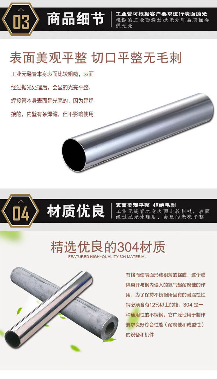 304薄壁不銹鋼管是除了圓管以外的其他截面形狀的鋼管的總稱, 有焊接異型管和無縫異型管。 因?yàn)椴馁|(zhì)的關(guān)系,不銹鋼異型管一般為304以上材質(zhì)為多,200、201材質(zhì)硬度強(qiáng)風(fēng),成型難度加大。