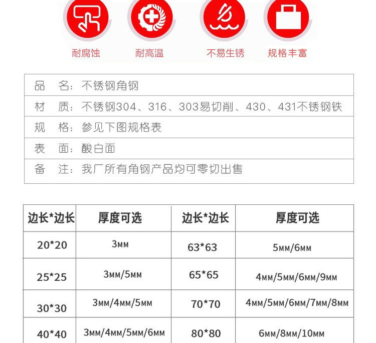 不銹鋼角鋼是兩邊互相垂直成角形的長條鋼材。有等邊不銹鋼角鋼和不等邊不銹鋼角鋼之分。等邊不銹鋼角鋼的兩個邊寬相等。其規格以邊寬×邊寬×邊厚的毫米數表示。如“∠25×25×3”,即表示邊寬為 25毫米、邊厚為3毫米的等邊不銹鋼角鋼。也可用型號表示,型號是邊寬的厘米數,如∠2.5#。型號不表示同一型號中不同邊厚的尺寸,因而在合同等單據上將不銹鋼角鋼的邊寬、邊厚尺寸填寫齊全,避免單獨用型號表示。熱軋等邊不銹鋼角鋼的規格為2#-20#。